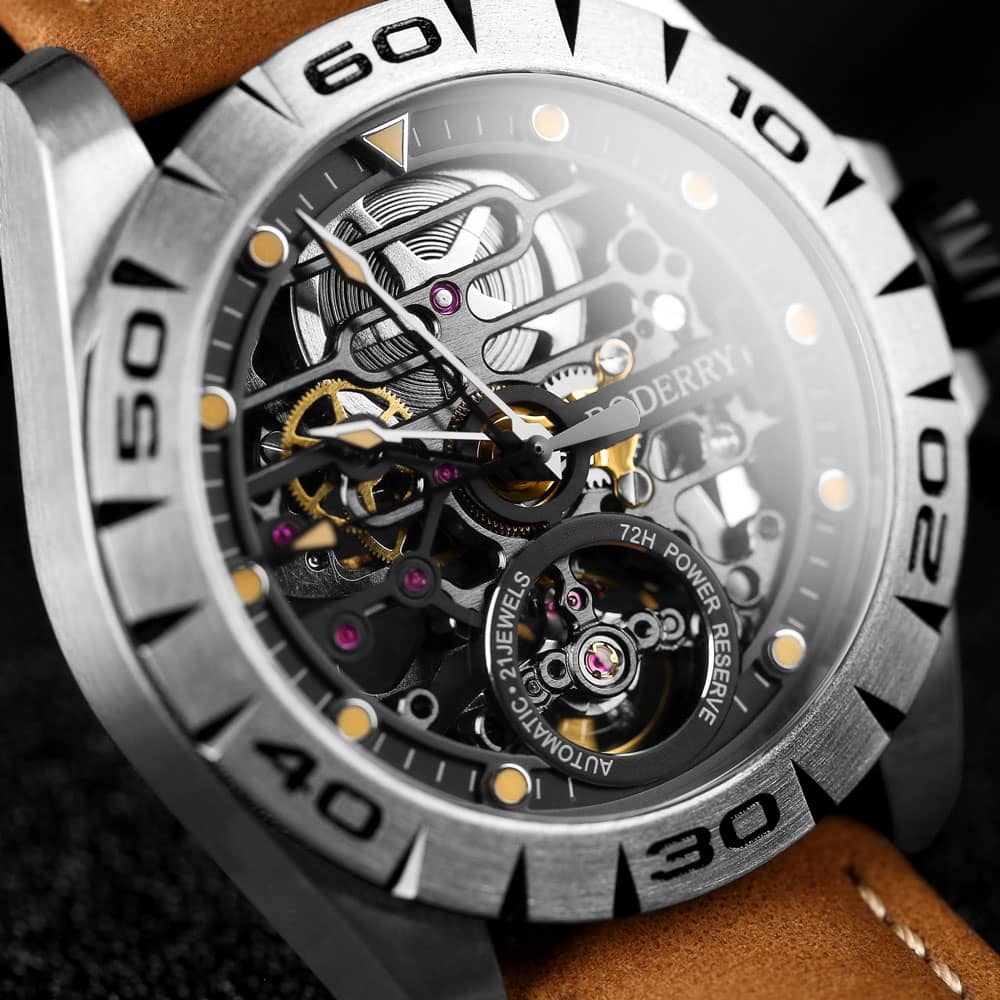 The customized AAA-level HANGZHOU 7500 movement is equipped with 21 synthetic jewel bearings, a power reserve of more than 72 hours and a frequency of 28,800 vibrations per hour, ensuring a precise timing from -15 ~ +25 seconds/24 hours.Visible mainspring for gauging how much power is left. Kinetic energy is harnessed from your activities and used to power the caliber,which make it not need battery to achieve a long-lasting and stable performance.