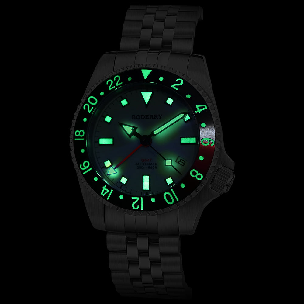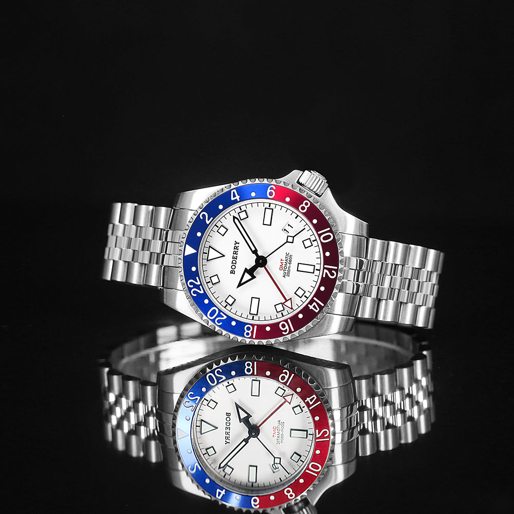 Introducing our latest collection for 2024 - the ADMIRAL GMT Titanium Automatic Dive Watch, also marking BODERRY's debut GMT timepiece. Crafted with a 40mm brushed titanium case, this watch features a bezel and dial coated with Japan's ultra-bright luminescent paint, enhancing visibility in low-light conditions. With a robust screw-down crown and case back, it boasts a water resistance of up to 200 meters. Equipped with scratch-resistant sapphire crystal glass, a precision Japanese GMT automatic movement (SEIKO NH34), and a solid 5-link titanium bracelet paired with a stainless steel clasp. The unique pentagonal star-shaped case back complements the series name, inspiring diving enthusiasts to embrace the spirit of naval warriors.
