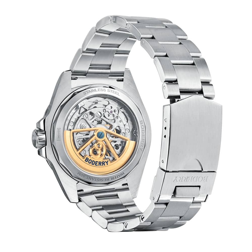 The customized AAA-level Automatic movement is equipped with 21 synthetic jewel bearings, a power reserve of more than 72 hours and a frequency of 28,800 vibrations per hour, ensuring a precise timing from -15 ~ +25 seconds/24 hours.Visible mainspring for gauging how much power is left. Kinetic energy is harnessed from your activities and used to power the caliber,which make it not need battery to achieve a long-lasting and stable performance.
